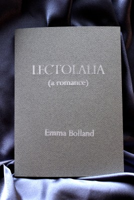 LECTOLALIA (a romance), with an accompanying short film of the same name, was created by Emma Bolland for the Leeds College of Art & Design ‘Library Interventions’ residencies; you can view the film at the link at the bottom of the page. For the Interventions, artists are invited to respond to the library and its collections. Bolland’s response deals with a passion for and seduction by words and texts, and she undertook a free-associative drift through the stacks, selecting books intuitively by heft, texture and appearance. Fragments of phrases taken from the books she encountered are incorporated into the work. In a performance of the draft text she invited